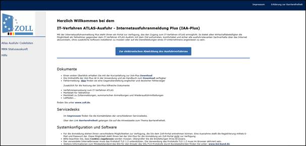 Den Zugang zu Ihrer persönlichen Arbeitsumgebung der IAA-Plus erreichen Sie über das Zoll-Portal und der anschließenden Auswahl der Dienstleistung „Internet-Ausfuhr-Anmeldung-Plus (IAA-Plus)“. Sie gelangen zuerst auf die Startseite der IAA-Plus:
