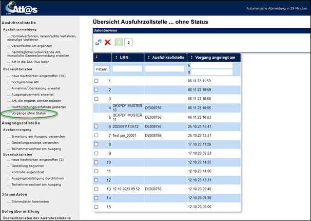Über den Menüpunkt „...Vorgänge ohne Status“ gelangen Sie auf den dazugehörigen „Datenbrowser“.