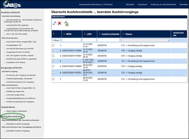 Innerhalb des Navigationsbereiches „Belegübermittlung“ haben Sie die Möglichkeit, Ausfuhranmeldungen bzw. -vorgänge, die nicht mehr bearbeitet werden können, herunterzuladen, um sie zu archivieren.
