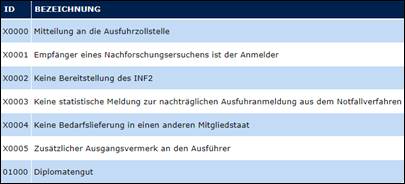 In diesem Feld ist der zollrechtliche Ausführer anzumelden. Ist der außenwirtschaftsrechtliche Ausführer nicht mit dem zollrechtlichen Ausführer identisch, so ist der außenwirtschaftsrechtliche Ausführer gesondert anzumelden. |