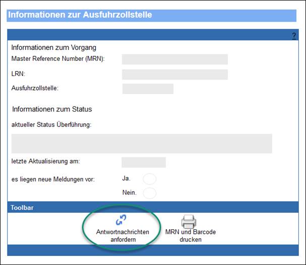 Nun kehren Sie im Verzeichnisbaum zum Formulartitel „Ausfuhrzollstelle“ zurück. Hier können Sie die Antwortnachrichten Ihrer Ausfuhrzollstelle anfordern.